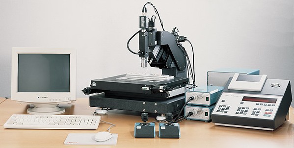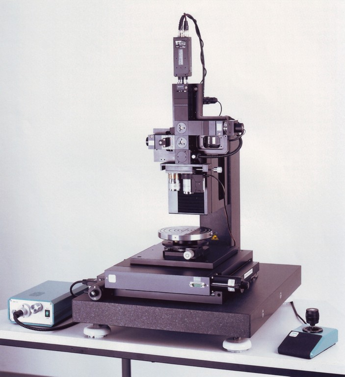 Dazu zählen z.B. Spezialobjektive, Tubusaufbauten aus unserem Bauteileprogramm, Sonderkreuz-, Hub- und Drehtische, ein- oder mehrachsige Stativaufbauten, Passlochstanzen oder Mikromontageplätze.